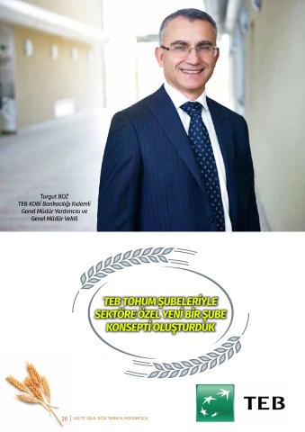 Turgut BOZ TEB KOBİ Bankacılığı Kıdemli Genel Müdür Yardımcısı ve Genel Müdür Vekili TEB TOHUM ŞUBELERİYLE SEKTÖRE ÖZEL YENİ BİR ŞUBE KONSEPTİ OLUŞTURDUK 36 2023’E KALA: GIDA TARIM & HAYVANCILIK